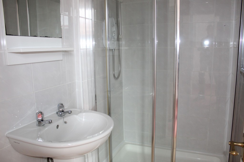 Pedestal wash basin, shower tray with wall mounted electric shower and screen door, extractor fan, fully tiled surround.