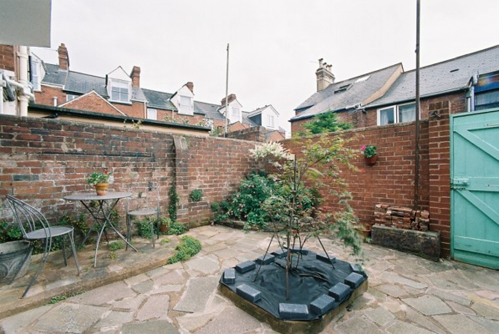 Rear Garden: Enclosed courtyard garden with crazy paved flooring, flowerbeds stocked with shrubs and trees, pedestrian access to service lane.